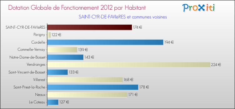 Le graphique ci dessous indique la Dotation Globale de Fonctionnement accordée par habitant à Saint-Cyr-de-Favières en 2012 par rapport aux communes voisines.