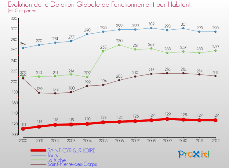 Dans le même temps, la Dotation Globale de Fonctionnement accordée aux communes françaises similaires à Saint-Cyr-sur-Loire était de 235 € par habitant, en 2012.