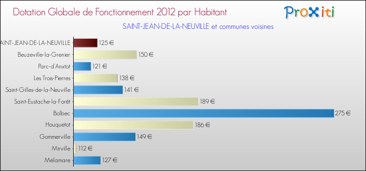 Le graphique ci dessous indique la Dotation Globale de Fonctionnement accordée par habitant à Saint-Jean-de-la-Neuville en 2012 par rapport aux communes voisines.