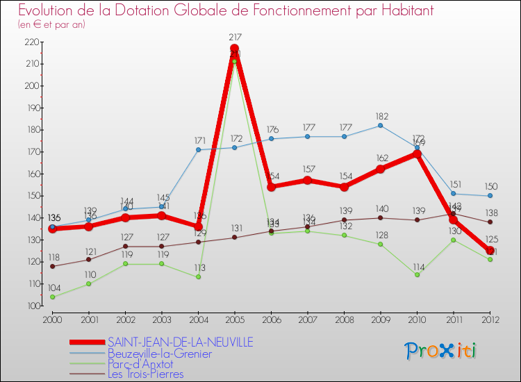 Dans le même temps, la Dotation Globale de Fonctionnement accordée aux communes françaises similaires à Saint-Jean-de-la-Neuville était de 173 € par habitant, en 2012.