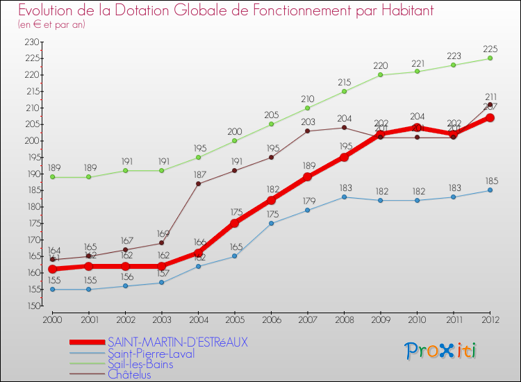 A Saint-Martin-d'Estréaux, en 2012 un habitant reçoit donc plus de subventions au titre de la DGF que pour des communes similaires.