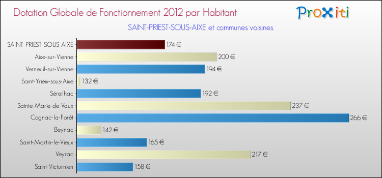 Le graphique ci dessous indique la Dotation Globale de Fonctionnement accordée par habitant à Saint-Priest-sous-Aixe en 2012 par rapport aux communes voisines.