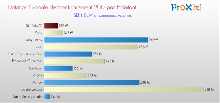 Le graphique ci dessous indique la Dotation Globale de Fonctionnement accordée par habitant à Senneçay en 2012 par rapport aux communes voisines.