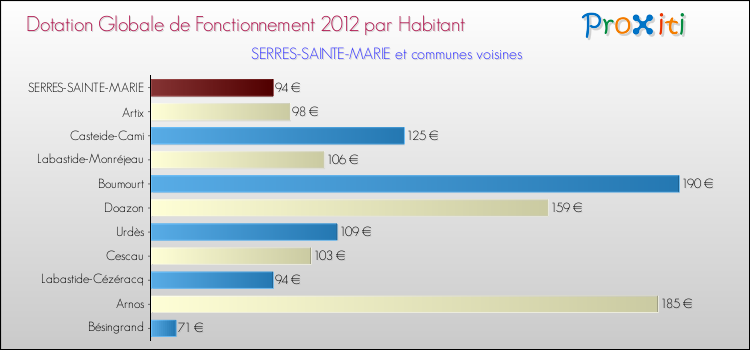 Le graphique ci dessous indique la Dotation Globale de Fonctionnement accordée par habitant à Serres-Sainte-Marie en 2012 par rapport aux communes voisines.