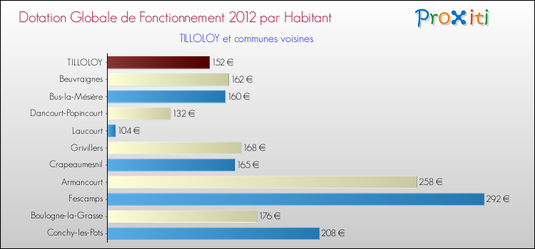 Le graphique ci dessous indique la Dotation Globale de Fonctionnement accordée par habitant à Tilloloy en 2012 par rapport aux communes voisines.