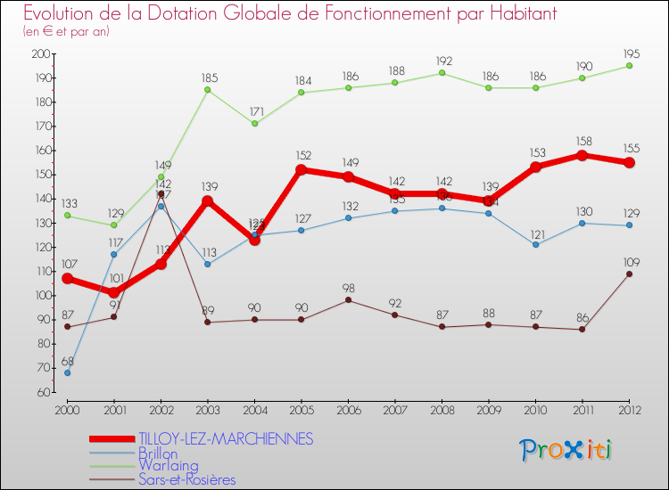 Dans le même temps, la Dotation Globale de Fonctionnement accordée aux communes françaises similaires à Tilloy-lez-Marchiennes était de 173 € par habitant, en 2012.