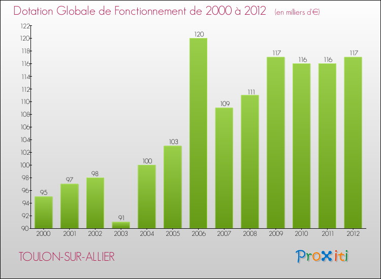 En effet, la dotation globale de fonctionnement versée par l'état en 2012 à la seule commune de Toulon-sur-Allier était de : 117 000 € au total.