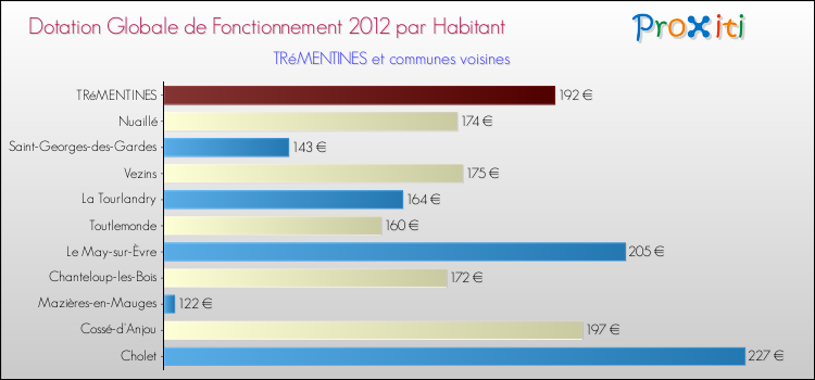 Le graphique ci dessous indique la Dotation Globale de Fonctionnement accordée par habitant à Trémentines en 2012 par rapport aux communes voisines.