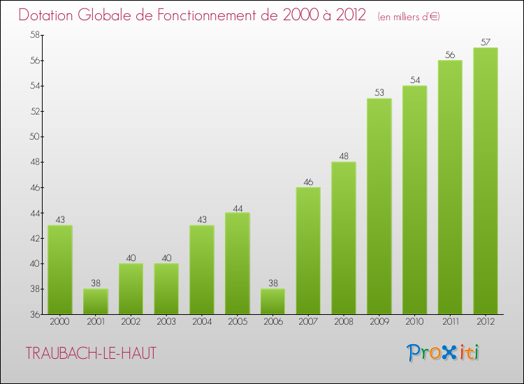 En effet, la dotation globale de fonctionnement versée par l'état en 2012 à la seule commune de Traubach-le-Haut était de : 57 000 € au total.
