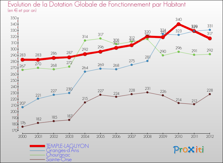 Dans le même temps, la Dotation Globale de Fonctionnement accordée aux communes françaises similaires à Temple-Laguyon était de 232 € par habitant, en 2012.