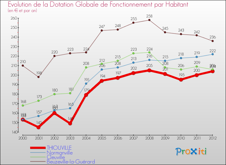 Dans le même temps, la Dotation Globale de Fonctionnement accordée aux communes françaises similaires à Thiouville était de 200 € par habitant, en 2012.