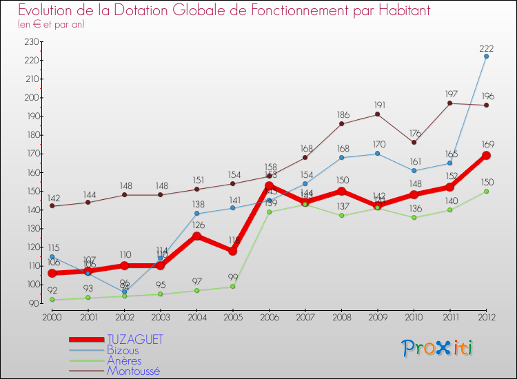 Dans le même temps, la Dotation Globale de Fonctionnement accordée aux communes françaises similaires à Tuzaguet était de 200 € par habitant, en 2012.