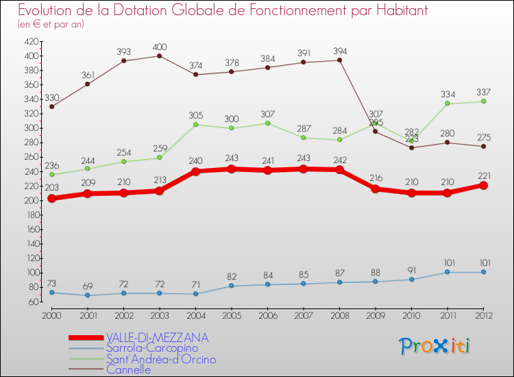 Dans le même temps, la Dotation Globale de Fonctionnement accordée aux communes françaises similaires à Valle-di-Mezzana était de 181 € par habitant, en 2012.