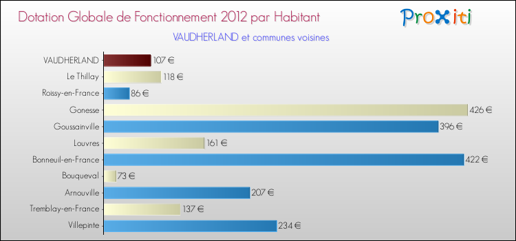 Le graphique ci dessous indique la Dotation Globale de Fonctionnement accordée par habitant à Vaudherland en 2012 par rapport aux communes voisines.