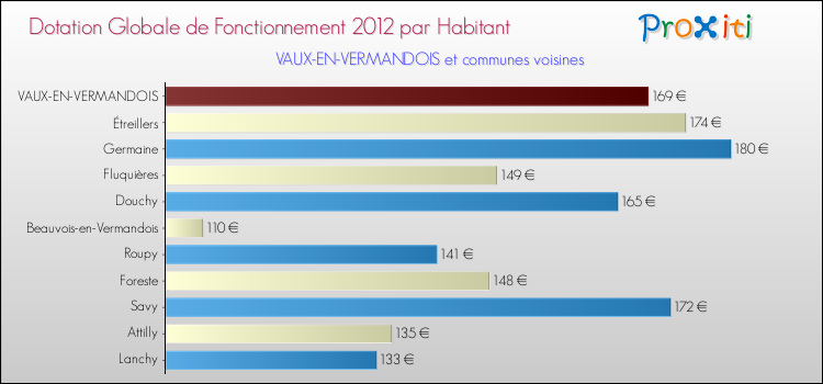 Le graphique ci dessous indique la Dotation Globale de Fonctionnement accordée par habitant à Vaux-en-Vermandois en 2012 par rapport aux communes voisines.