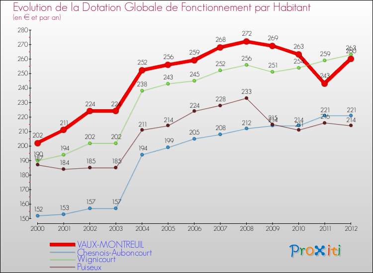 Dans le même temps, la Dotation Globale de Fonctionnement accordée aux communes françaises similaires à Vaux-Montreuil était de 232 € par habitant, en 2012.