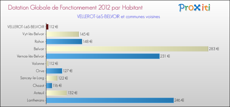 Le graphique ci dessous indique la Dotation Globale de Fonctionnement accordée par habitant à Vellerot-lès-Belvoir en 2012 par rapport aux communes voisines.