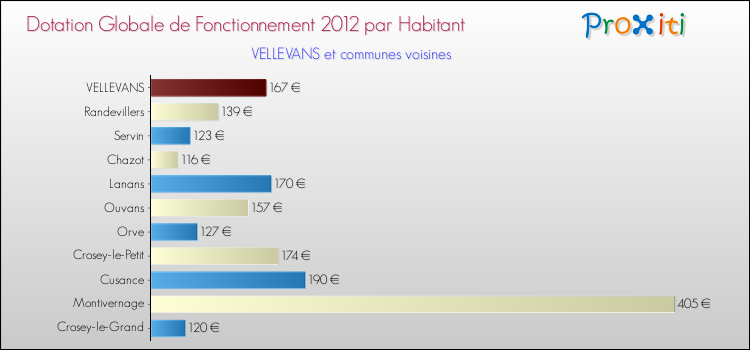Le graphique ci dessous indique la Dotation Globale de Fonctionnement accordée par habitant à Vellevans en 2012 par rapport aux communes voisines.