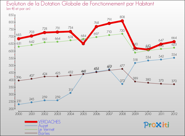 Dans le même temps, la Dotation Globale de Fonctionnement accordée aux communes françaises similaires à Verdaches était de 232 € par habitant, en 2012.