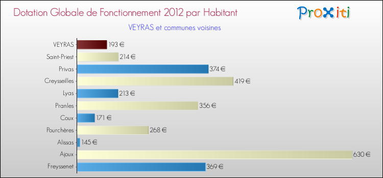 Dans le même temps, la Dotation Globale de Fonctionnement accordée aux communes françaises similaires à Veyras était de 214 € par habitant, en 2012.