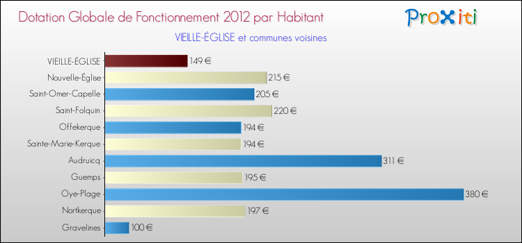 Le graphique ci dessous indique la Dotation Globale de Fonctionnement accordée par habitant à Vieille-Église en 2012 par rapport aux communes voisines.