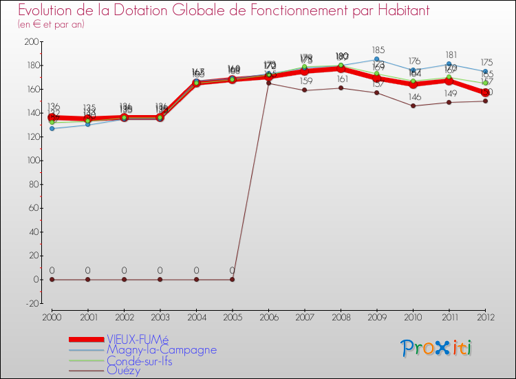 Dans le même temps, la Dotation Globale de Fonctionnement accordée aux communes françaises similaires à Vieux-Fumé était de 181 € par habitant, en 2012.
