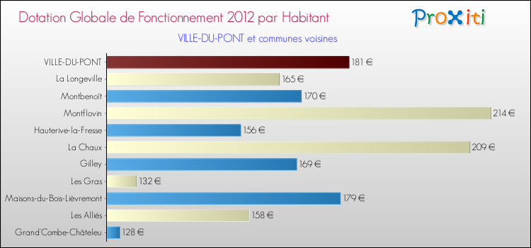Le graphique ci dessous indique la Dotation Globale de Fonctionnement accordée par habitant à Ville-du-Pont en 2012 par rapport aux communes voisines.