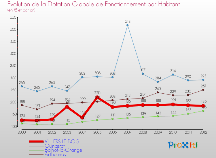 Dans le même temps, la Dotation Globale de Fonctionnement accordée aux communes françaises similaires à Villiers-le-Bois était de 232 € par habitant, en 2012.