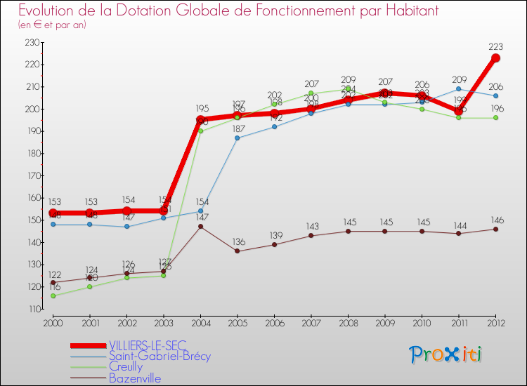 Dans le même temps, la Dotation Globale de Fonctionnement accordée aux communes françaises similaires à Villiers-le-Sec était de 200 € par habitant, en 2012.