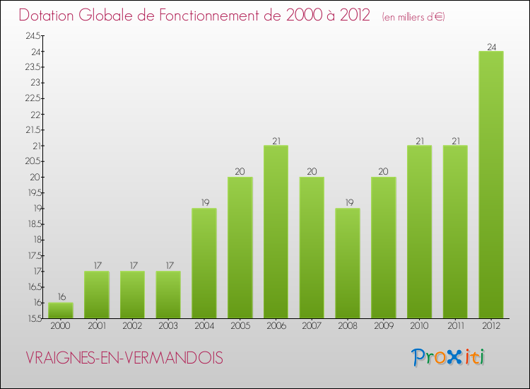 En effet, la dotation globale de fonctionnement versée par l'état en 2012 à la seule commune de Vraignes-en-Vermandois était de : 24 000 € au total.