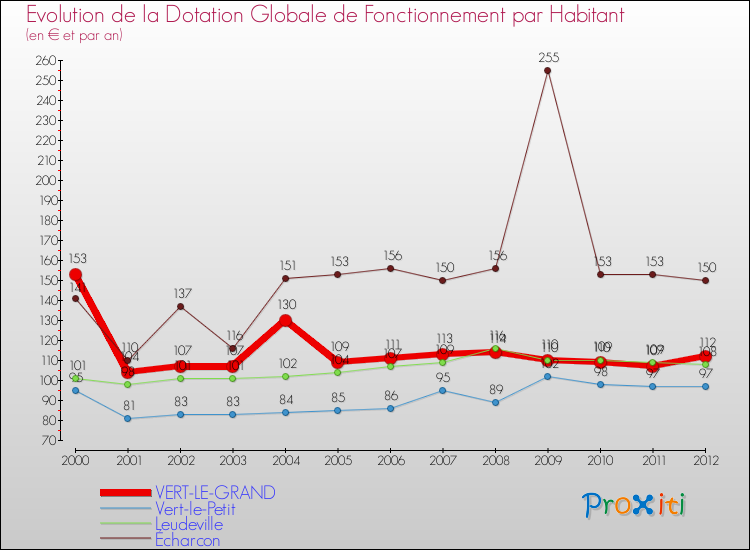 Dans le même temps, la Dotation Globale de Fonctionnement accordée aux communes françaises similaires à Vert-le-Grand était de 183 € par habitant, en 2012.