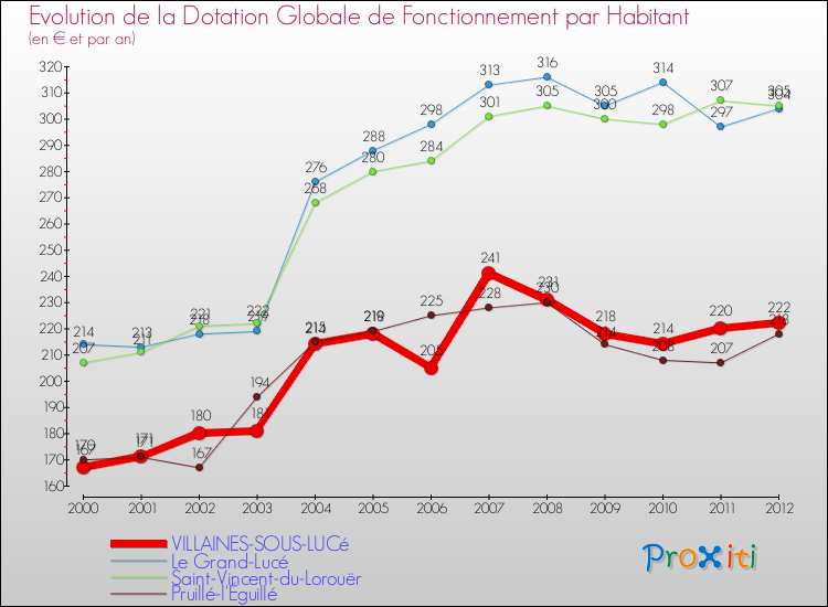 Dans le même temps, la Dotation Globale de Fonctionnement accordée aux communes françaises similaires à Villaines-sous-Lucé était de 214 € par habitant, en 2012.
