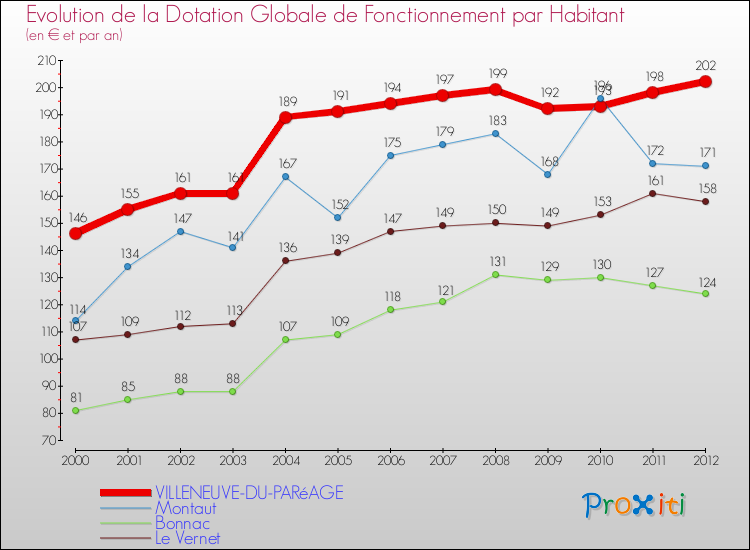 Dans le même temps, la Dotation Globale de Fonctionnement accordée aux communes françaises similaires à Villeneuve-du-Paréage était de 214 € par habitant, en 2012.