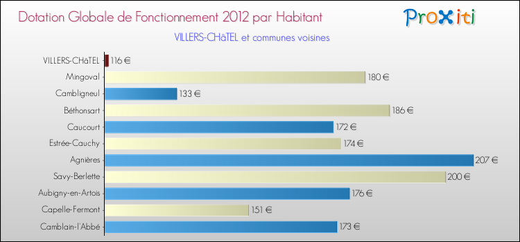 Dans le même temps, la Dotation Globale de Fonctionnement accordée aux communes françaises similaires à Villers-Châtel était de 228 € par habitant, en 2012.