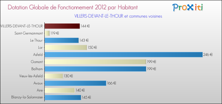 Le graphique ci dessous indique la Dotation Globale de Fonctionnement accordée par habitant à Villers-devant-le-Thour en 2012 par rapport aux communes voisines.