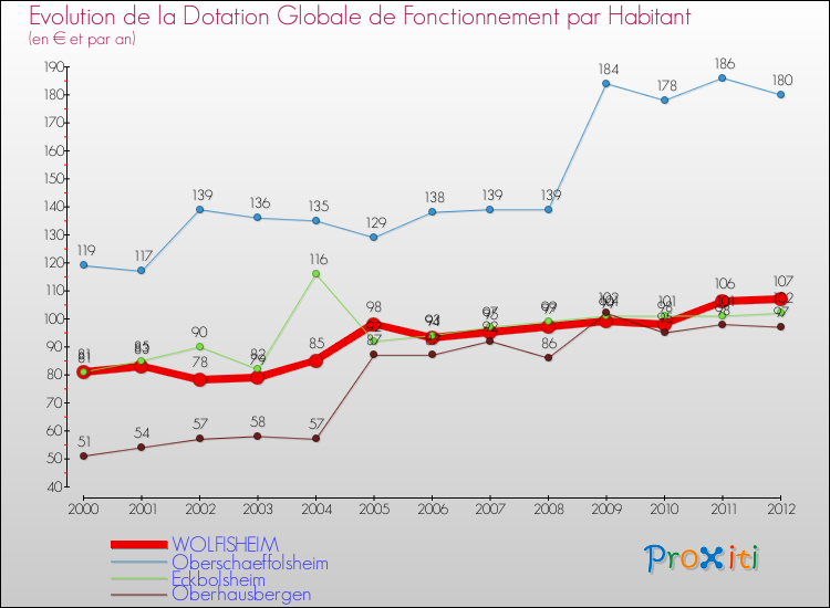 Dans le même temps, la Dotation Globale de Fonctionnement accordée aux communes françaises similaires à Wolfisheim était de 192 € par habitant, en 2012.