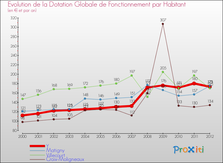 Dans le même temps, la Dotation Globale de Fonctionnement accordée aux communes françaises similaires à Y était de 232 € par habitant, en 2012.