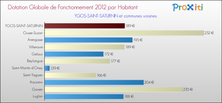 Le graphique ci dessous indique la Dotation Globale de Fonctionnement accordée par habitant à Ygos-Saint-Saturnin en 2012 par rapport aux communes voisines.
