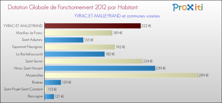 Le graphique ci dessous indique la Dotation Globale de Fonctionnement accordée par habitant à Yvrac-et-Malleyrand en 2012 par rapport aux communes voisines.
