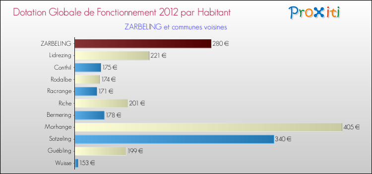 Le graphique ci dessous indique la Dotation Globale de Fonctionnement accordée par habitant à Zarbeling en 2012 par rapport aux communes voisines.