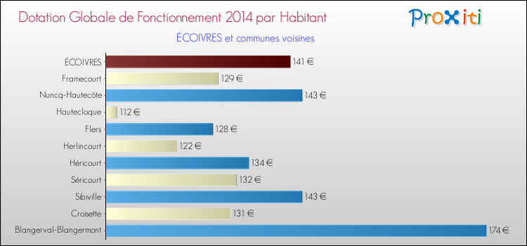 Le graphique ci dessous indique la Dotation Globale de Fonctionnement accordée par habitant à Écoivres en 2014 par rapport aux communes voisines.