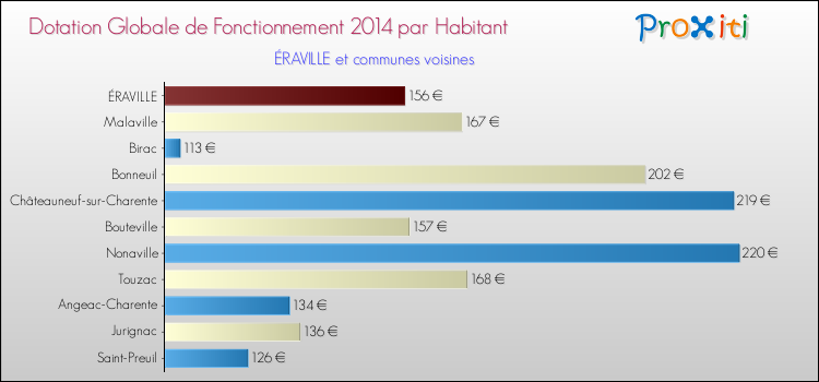 Le graphique ci dessous indique la Dotation Globale de Fonctionnement accordée par habitant à Éraville en 2014 par rapport aux communes voisines.