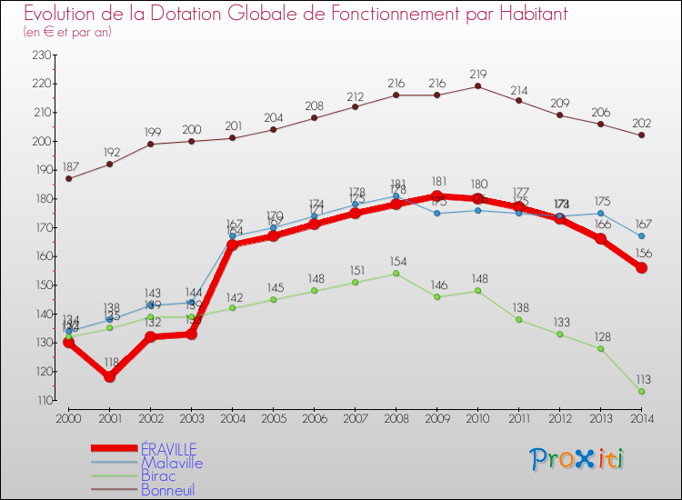 Rapporté aux 215 habitants de Éraville en 2014, cela représente 156 € par habitant (en baisse de 6.02 % par rapport à 2013).
