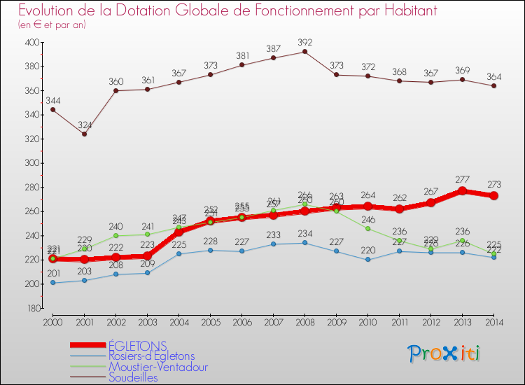 Dans le même temps, la Dotation Globale de Fonctionnement accordée aux communes françaises similaires à Égletons était de 196 € par habitant, en 2014.