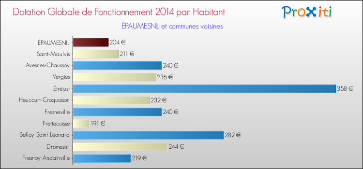 Le graphique ci dessous indique la Dotation Globale de Fonctionnement accordée par habitant à Épaumesnil en 2014 par rapport aux communes voisines.