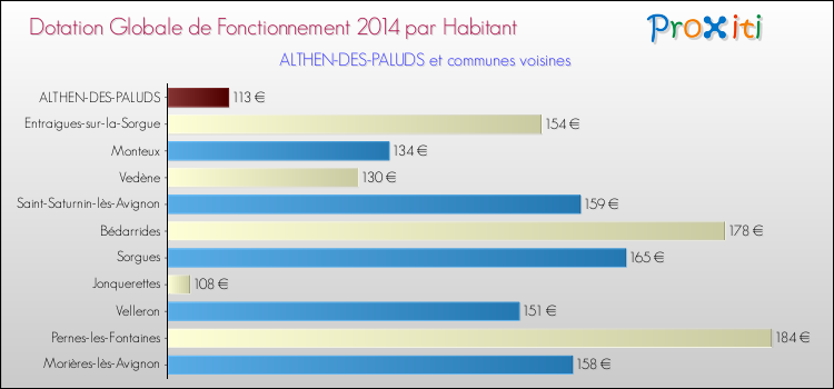Le graphique ci dessous indique la Dotation Globale de Fonctionnement accordée par habitant à Althen-des-Paluds en 2014 par rapport aux communes voisines.