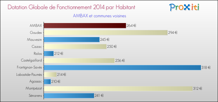 Le graphique ci dessous indique la Dotation Globale de Fonctionnement accordée par habitant à Ambax en 2014 par rapport aux communes voisines.