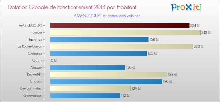 Le graphique ci dessous indique la Dotation Globale de Fonctionnement accordée par habitant à Amenucourt en 2014 par rapport aux communes voisines.