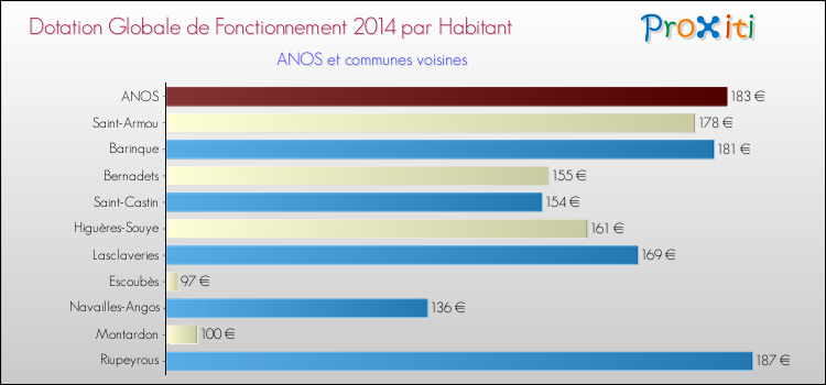 Le graphique ci dessous indique la Dotation Globale de Fonctionnement accordée par habitant à Anos en 2014 par rapport aux communes voisines.