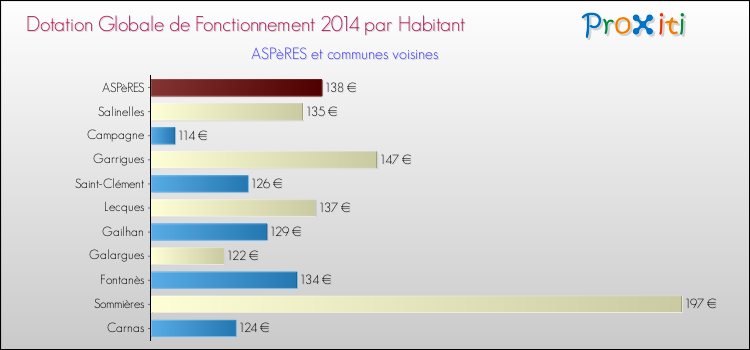 Le graphique ci dessous indique la Dotation Globale de Fonctionnement accordée par habitant à Aspères en 2014 par rapport aux communes voisines.